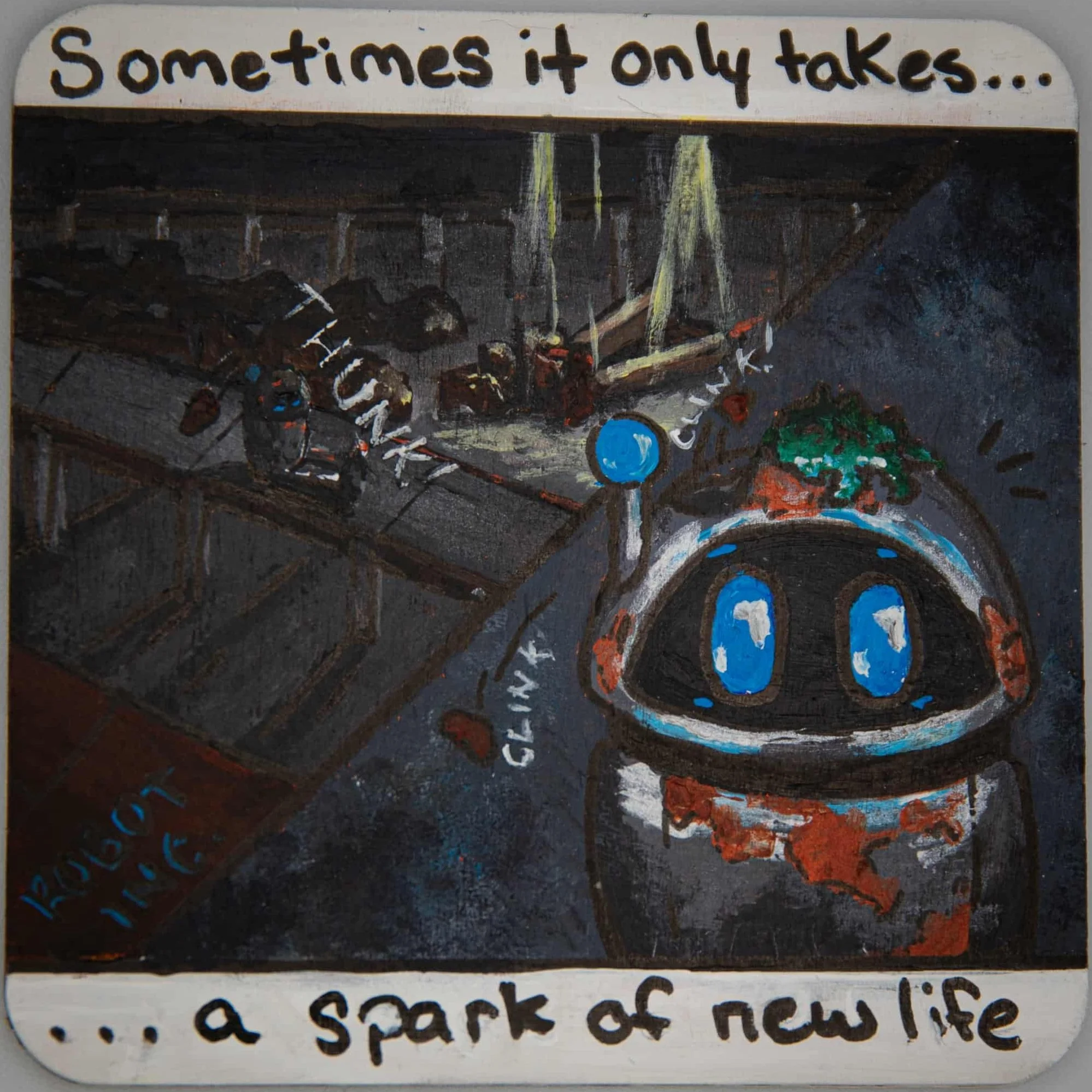 Reawakening with new life, the little robot creature jumps off from its place on the conveyor